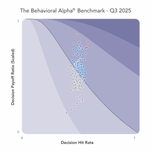 Our latest (three years ended September 30, 2025) Essentia Behavioral Alpha Benchmark ranking shows a modest pullback in median Behavioral Alpha Scores following Q2’s rebound, yet continued strength in execution-driven decision types. The median Behavioral Alpha Score for the 133 portfolio managers in our ranking — which measures the value added through decision-making, when compared with what would have been achieved by chance — was 49.3, down from 50.6 in the prior period.