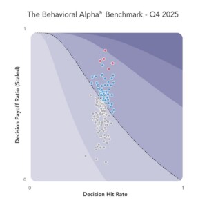 - Decision-making outcomes weakened broadly. The median Behavioral Alpha Score fell to 47.7, with fewer than 40% of portfolios adding value overall. Measures of hit rate and payoff both declined, marking the weakest quarter across several metrics in the three-year history of the Benchmark.