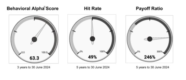 Essentia’s Behavioral Alpha analysis captures the effect of that approach. Over recent years, James and Sam have delivered a Behavioral Alpha Score of 63.3, reflecting consistently skilled decision-making across stock picking, timing and sizing. Their hit rate, at 49 percent, is not unusual among top investors; even the best often make more wrong calls than right ones. What matters is the asymmetry of outcomes. With a payoff ratio of 246 percent, their average winner has added nearly two and a half times as much value as the average loser has destroyed. It is this ability to let winners run and cut losers early — rather than a high batting average — that marks a defining pattern Essentia sees in top performers.