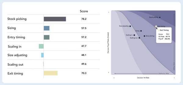 Where traditional models define investor skill in terms of just two broad categories (allocation vs. selection in the case of Brinson, or a generic alpha in the case of Fama-French), Essentia looks at a spectrum of seven key decision types that an equity portfolio manager makes in practice: stock picking, position sizing, entry timing, scaling in, size adjusting, scaling out, and exit timing.