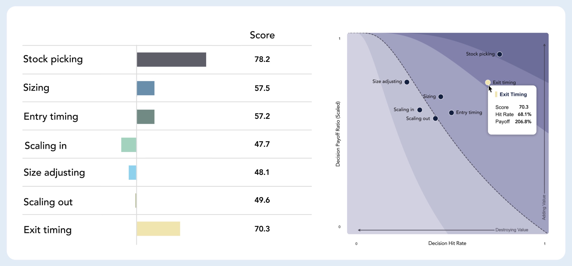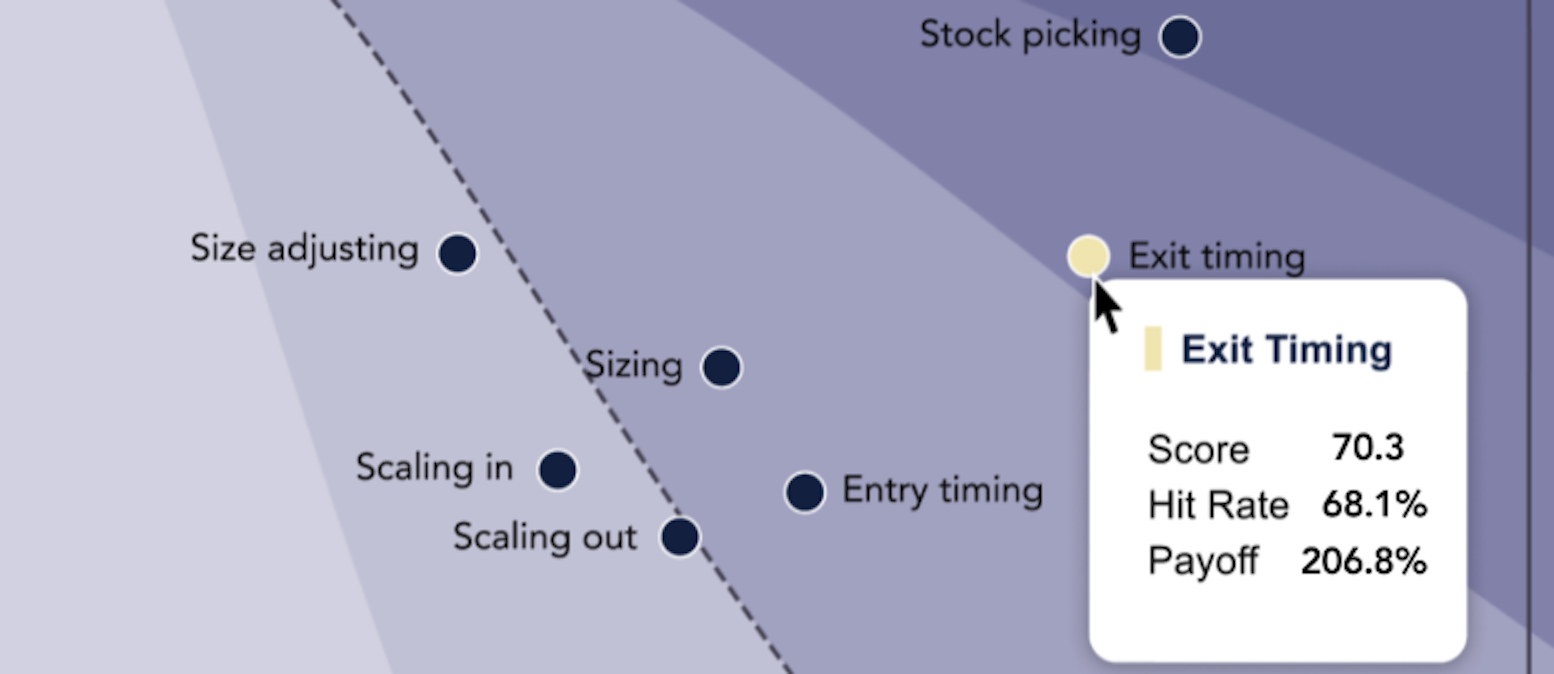 Essentia’s Behavioral Alpha decision analysis shows where a manager is adding value (in this case, decisions around stock picking, timing and sizing) and where there’s room for improvement (scaling in/out and size adjusting strategies). The upper right quadrant of the scatter plot — furthest away from 0,0 — represents the highest value-add.